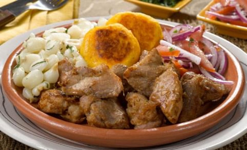La base y protagonista de este plato es la carne y grasa (manteca) de cerdo "chancho", que se cocina en agua hirviendo con condimentos varios y luego se fríe con la grasa del cerdo en una paila de bronce o sartén sobre las llamas, y una vez cocinada va acompañada con "mote", "salsa de cebolla", aguacate, papas asadas, "chifles" y plátanos maduros fritos.