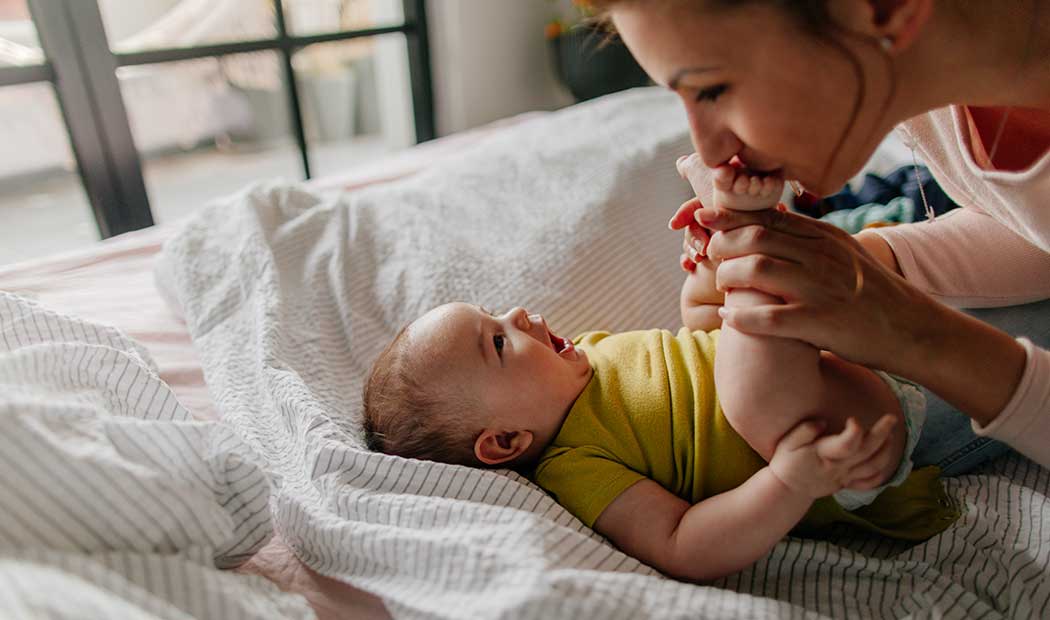Convierta el aprendizaje en una experiencia que implique todo su cuerpo: Toque un dedo del bebé mientras diga la palabra "dedo". O señale su propia oreja y diga: "la oreja de mamá (o de papá)". Oriente su rostro hacia el del bebé cuando le hable para que pueda ver su expresión facial y los movimientos de sus labios.