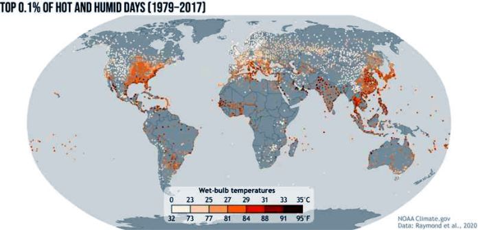 Raymond señala que la máxima temperatura de bulbo húmedo que los seres humanos pueden soportar al estar expuestos a los elementos durante al menos seis horas es de unos 35 grados Celsius. Las temperaturas de bulbo húmedo están aumentando globalmente, y ya se han registrado superaciones de este límite.